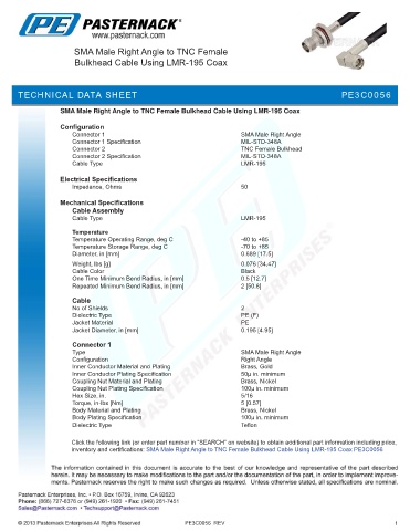 inventory and certifications: SMA Male Right Angle to TNC Female Bulkhead Cable Using LMR-195 Coax PE3C0056