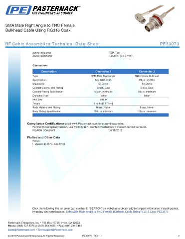 inventory and certifications: SMA Male Right Angle to TNC Female Bulkhead Cable Using RG316 Coax PE33073