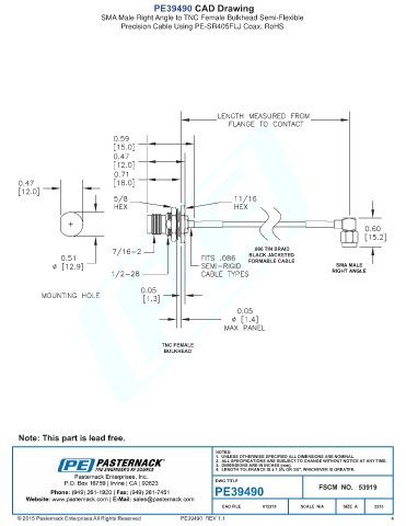 PE39490 CAD Drawing SMA Male Right Angle to TNC Female Bulkhead Semi-Flexible Precision Cable Using PE-SR405FLJ Coax, RoHS PE39490 REV 1.1 4