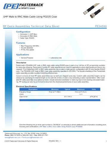 coax. The PE34589 UHF male to BNC male cable assembly operates to 300 MHz. The double shielding of this Pasternack