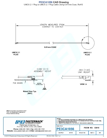 PE3CA1056 CAD Drawing UMCX 2.1 Plug to UMCX 2.1 Plug Cable Using 0.81mm Coax, RoHS PE3CA1056 REV 1.2 4