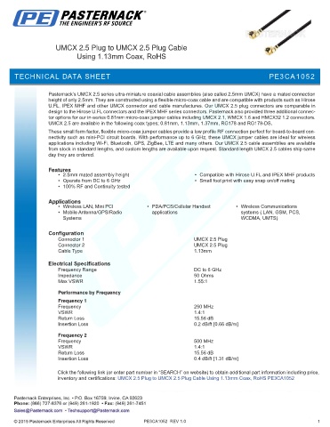 inventory and certifications: UMCX 2.5 Plug to UMCX 2.5 Plug Cable Using 1.13mm Coax, RoHS PE3CA1052