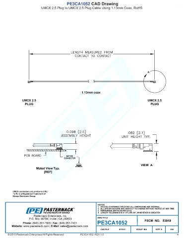 PE3CA1052 CAD Drawing UMCX 2.5 Plug to UMCX 2.5 Plug Cable Using 1.13mm Coax, RoHS PE3CA1052 REV 1.0 4