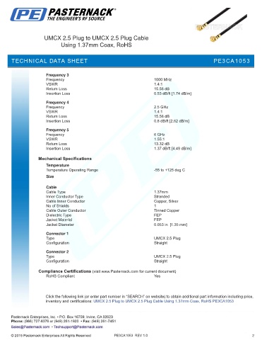 inventory and certifications: UMCX 2.5 Plug to UMCX 2.5 Plug Cable Using 1.37mm Coax, RoHS PE3CA1053