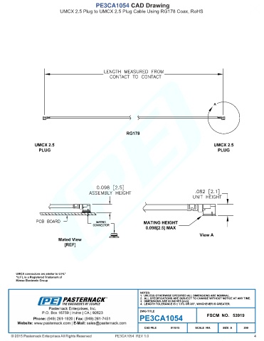 PE3CA1054 CAD Drawing UMCX 2.5 Plug to UMCX 2.5 Plug Cable Using RG178 Coax, RoHS PE3CA1054 REV 1.0 4