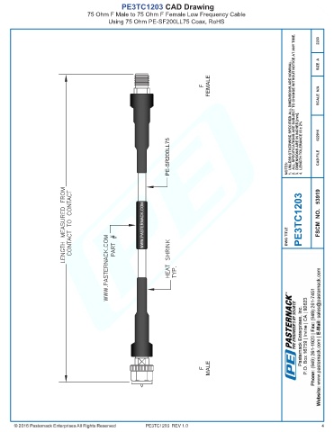 PE3TC1203 CAD Drawing 75 Ohm F Male to 75 Ohm F Female Low Frequency Cable Using 75 Ohm PE-SF200LL75 Coax, RoHS PE3TC1203 REV 1.0 4