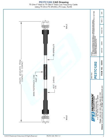 PE3TC1202 CAD Drawing 75 Ohm F Male to 75 Ohm F Male Low Frequency Cable Using 75 Ohm PE-SF200LL75 Coax, RoHS PE3TC1202 REV 1.0 4
