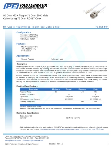 Pasternack’s PE3C5491 50 ohm MCX plug to 75 ohm BNC male cable using 75 ohm RG187 coax is part of our full line of RF