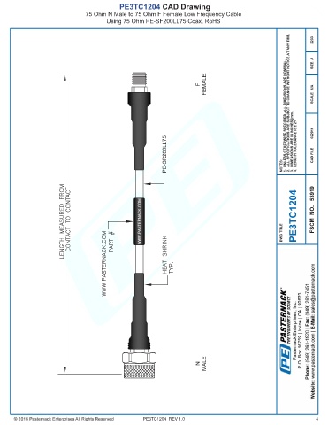 PE3TC1204 CAD Drawing 75 Ohm N Male to 75 Ohm F Female Low Frequency Cable Using 75 Ohm PE-SF200LL75 Coax, RoHS PE3TC1204 REV 1.0 4