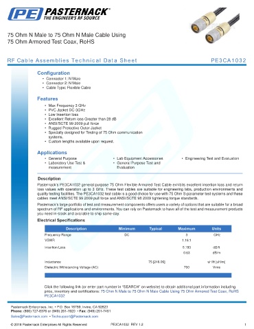 quality testing facilities. The PE3CA1032 test cable is a good choice for use with 75 Ohm S-parameter test systems and these