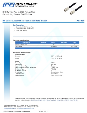 inventory and certifications: BNC Twinax Plug to BNC Twinax Plug Cable Using 78 Ohm RG108 Coax PE3480