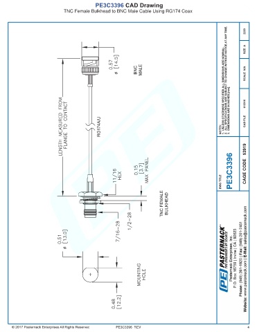 PE3C3396 CAD Drawing TNC Female Bulkhead to BNC Male Cable Using RG174 Coax PE3C3396 REV 4