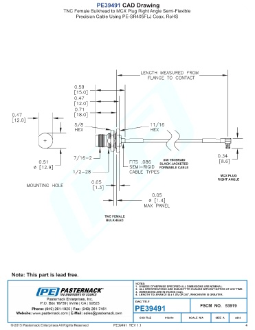PE39491 CAD Drawing TNC Female Bulkhead to MCX Plug Right Angle Semi-Flexible Precision Cable Using PE-SR405FLJ Coax, RoHS PE39491 REV 1.1 4