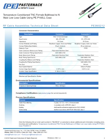 inventory and certifications: Temperature Conditioned TNC Female Bulkhead to N Male Low Loss Cable Using PE-P160LL