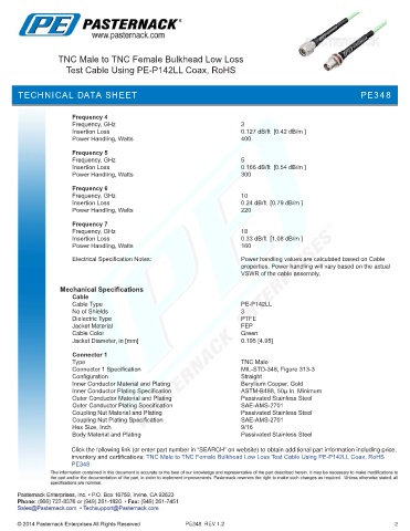 inventory and certifications: TNC Male to TNC Female Bulkhead Low Loss Test Cable Using PE-P142LL Coax, RoHS