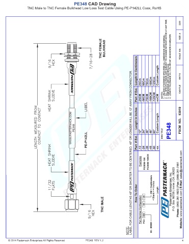 PE348 CAD Drawing TNC Male to TNC Female Bulkhead Low Loss Test Cable Using PE-P142LL Coax, RoHS © 2014 Pasternack Enterprises All Rights Reserved PE348 REV 1.2 4