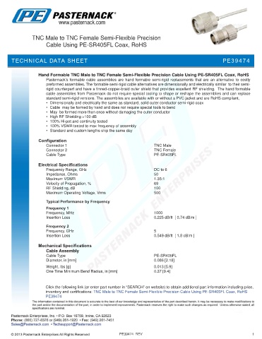 inventory and certifications: TNC Male to TNC Female Semi-Flexible Precision Cable Using PE-SR405FL Coax, RoHS