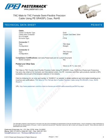 inventory and certifications: TNC Male to TNC Female Semi-Flexible Precision Cable Using PE-SR405FL Coax, RoHS