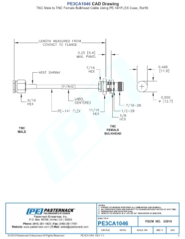 PE3CA1046 CAD Drawing TNC Male to TNC Female Bulkhead Cable Using PE-141FLEX Coax, RoHS PE3CA1046 REV 1.1 6