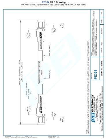 PE334 CAD Drawing TNC Male to TNC Male Low Loss Test Cable Using PE-P300LL Coax, RoHS PE334 REV 1.2 5