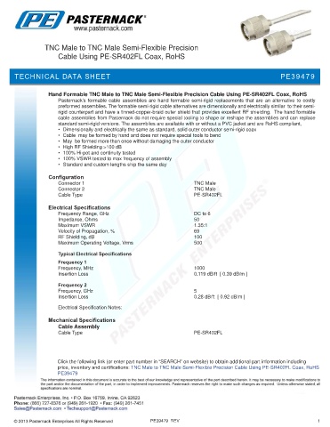 price, inventory and certifications: TNC Male to TNC Male Semi-Flexible Precision Cable Using PE-SR402FL Coax, RoHS