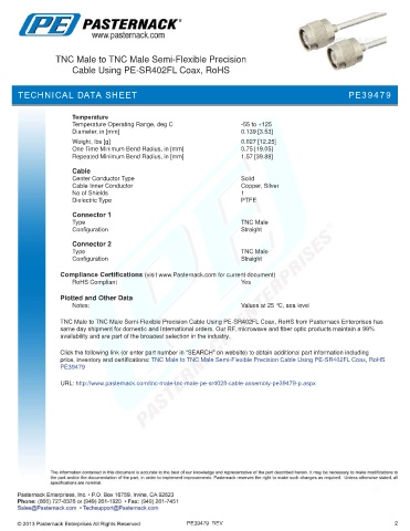 TNC Male to TNC Male Semi-Flexible Precision Cable Using PE-SR402FL Coax, RoHS from Pasternack Enterprises has