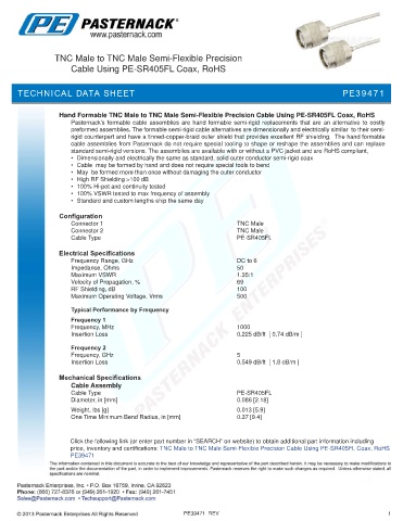 price, inventory and certifications: TNC Male to TNC Male Semi-Flexible Precision Cable Using PE-SR405FL Coax, RoHS