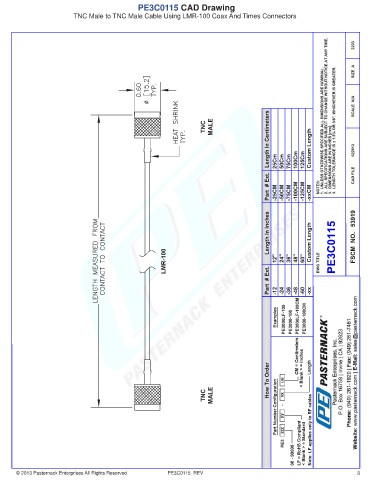 PE3C0115 CAD Drawing TNC Male to TNC Male Cable Using LMR-100 Coax And Times Connectors © 2013 Pasternack Enterprises All Rights Reserved PE3C0115 REV 3