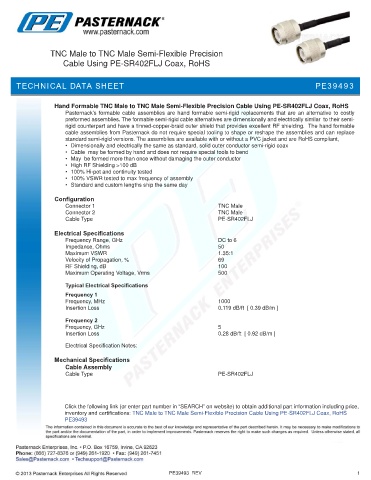 inventory and certifications: TNC Male to TNC Male Semi-Flexible Precision Cable Using PE-SR402FLJ Coax, RoHS