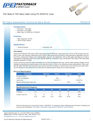Pasternack’s PE34275 TNC male to TNC male cable using PE-SR401AL coax is part of our full line of RF components avail-