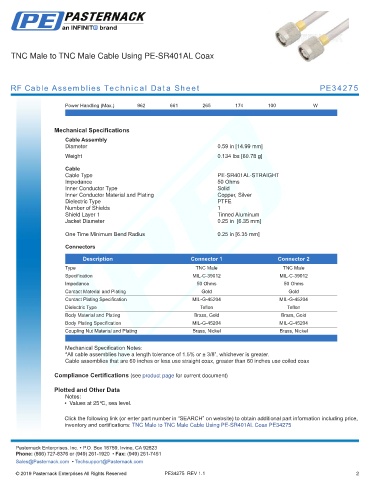 inventory and certifications: TNC Male to TNC Male Cable Using PE-SR401AL Coax PE34275