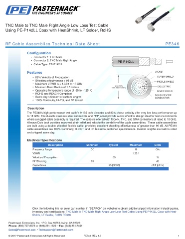 inventory and certifications: TNC Male to TNC Male Right Angle Low Loss Test Cable Using PE-P142LL Coax with Heat-