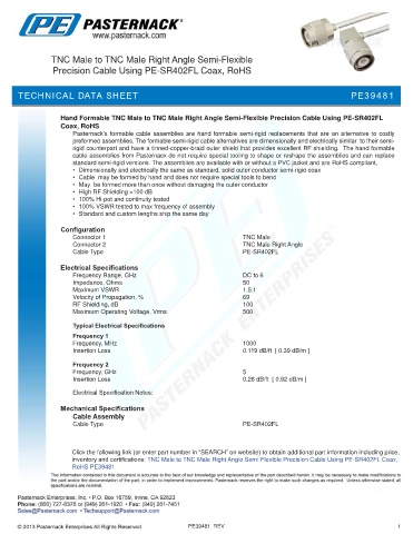 inventory and certifications: TNC Male to TNC Male Right Angle Semi-Flexible Precision Cable Using PE-SR402FL Coax,