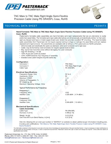 inventory and certifications: TNC Male to TNC Male Right Angle Semi-Flexible Precision Cable Using PE-SR405FL Coax,