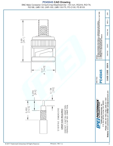 PE45045 CAD Drawing BNC Male Connector Crimp/Crimp Attachment for .100 inch, RG316, RG174, RG188, LMR-100, LMR-100, LMR-100-FR, PE-C100, PE-B100 PE45045 REV 1.5 3