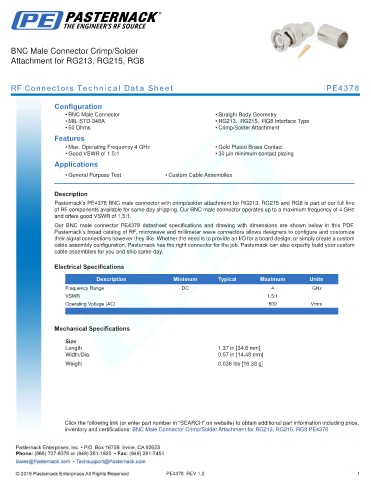 Our BNC male connector PE4378 datasheet specifications and drawing with dimensions are shown below in this PDF.