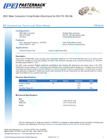 Pasternack’s PE4643 BNC male connector with crimp/solder attachment for RG178 and RG196 is part of our full line of RF