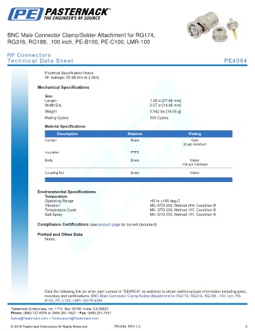inventory and certifications: BNC Male Connector Clamp/Solder Attachment for RG174, RG316, RG188, .100 inch, PE- -