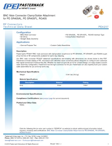 Pasternack’s PE4207 BNC male connector with clamp/solder attachment for PE-SR405AL, PE-SR405FL and RG405 is part