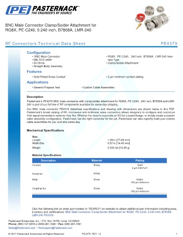 Pasternack’s PE4379 BNC male connector with clamp/solder attachment for RG8X, PE-C240, .240 inch, B7808A and LMR-