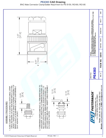 ASSEMBLY PROCEDURES 1. SLIDE CLAMP NUT (1) & GASKET (2) OVER CABLE. STRIP CABLE AS SHOWN. DO NOT NICK BRAID WHILE CUTTING JACKET. TAPER END OF BRAID TO PERMIT ASSEMBLY OF BRAID CLAMP (3) SLIDE BRAID CLAMP(3) OVER BRAID & SEAT AGAINST JACKET. 2. FORM BRAID OVER CLAMP NUT (3). TRIM BRAID BACK TO SHOULDER. CUT DIELECTRIC TO DIMENSION SHOWN. DO NOT NICK CENTER CONDUCTOR. SOLDER CONTACT TO CENTER CONDUCTOR. REMOVE EXCESS SOLDER. DO NOT OVER HEAT D
