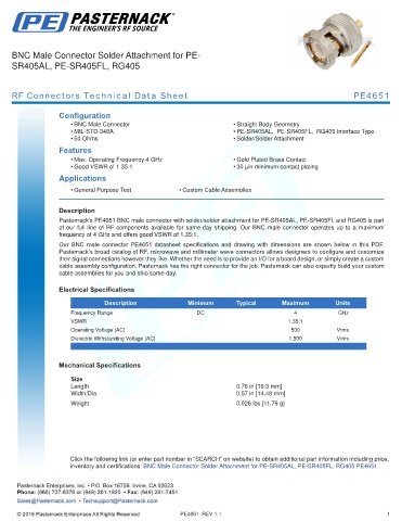 Pasternack’s PE4651 BNC male connector with solder/solder attachment for PE-SR405AL, PE-SR405FL and RG405 is part