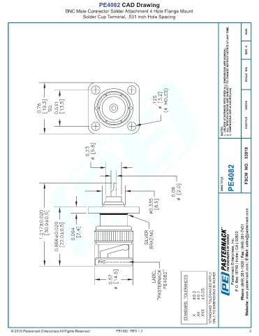 PE4082 CAD Drawing BNC Male Connector Solder Attachment 4 Hole Flange Mount Solder Cup Terminal, .531 inch Hole Spacing PE4082 REV 1.2 3