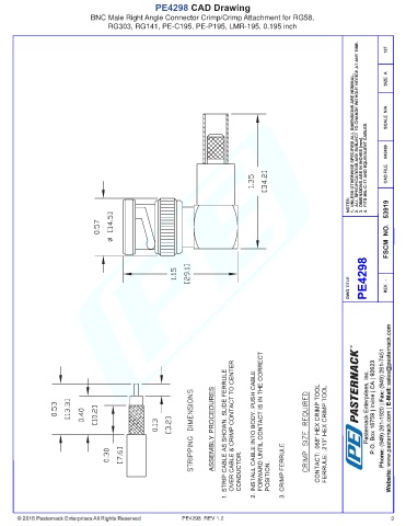 PE4298 CAD Drawing BNC Male Right Angle Connector Crimp/Crimp Attachment for RG58, RG303, RG141, PE-C195, PE-P195, LMR-195, 0.195 inch PE4298 REV 1.2 3