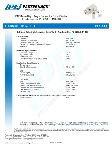 inventory and certifications: BNC Male Right Angle Connector Crimp/Solder Attachment For PE-C200, LMR-200 PE44843