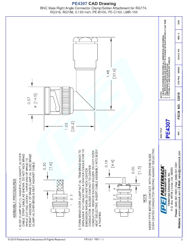 PE4307 CAD Drawing BNC Male Right Angle Connector Clamp/Solder Attachment for RG174, RG316, RG188, 0.100 inch, PE-B100, PE-C100, LMR-100 PE4307 REV 1.1 3