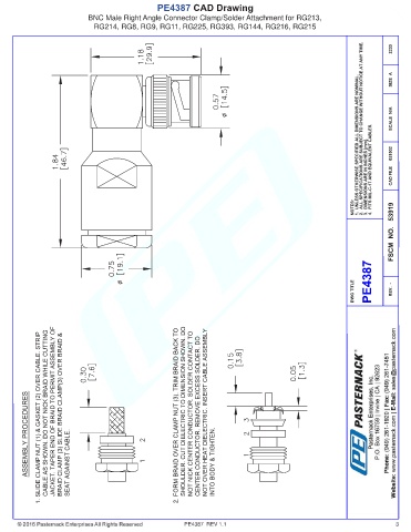 PE4387 CAD Drawing BNC Male Right Angle Connector Clamp/Solder Attachment for RG213, RG214, RG8, RG9, RG11, RG225, RG393, RG144, RG216, RG215 PE4387 REV 1.1 3