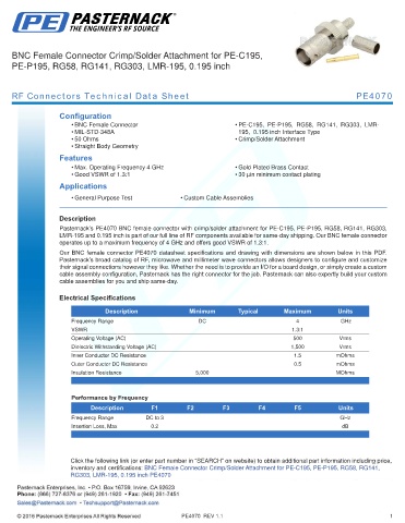 Pasternack’s PE4070 BNC female connector with crimp/solder attachment for PE-C195, PE-P195, RG58, RG141, RG303,