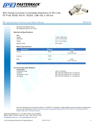 inventory and certifications: BNC Female Connector Crimp/Solder Attachment for PE-C195, PE-P195, RG58, RG141,
