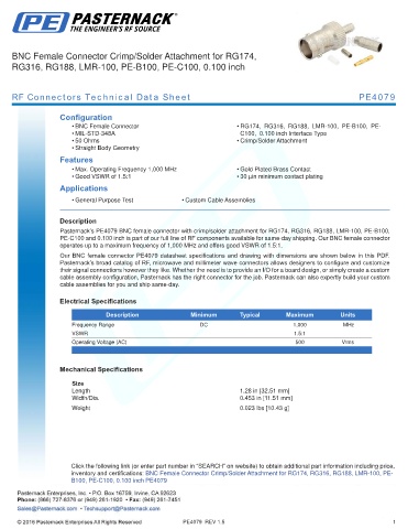 Pasternack’s PE4079 BNC female connector with crimp/solder attachment for RG174, RG316, RG188, LMR-100, PE-B100,